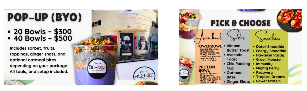 Includes sorbet, fruits, toppings, ginger shots, and optional oatmeal bites depending on your package. All tools, and setup included